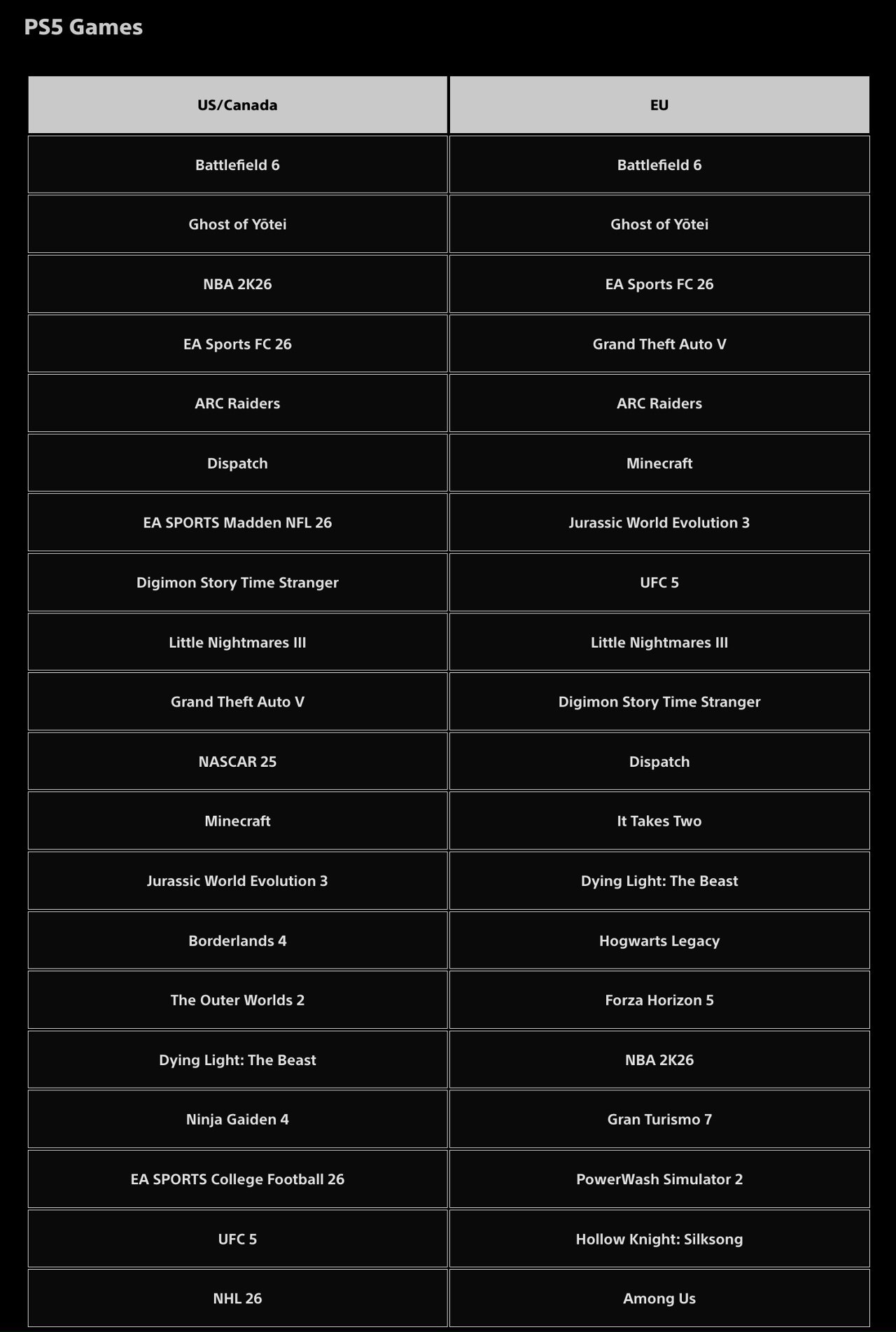 На первом месте Battlefield 6, а сразу за ней — Ghost of Yotei, особенно популярная в США и Европе.